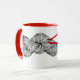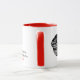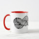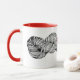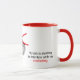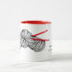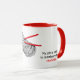 Ett anpassade mugg för en skarp kroscheter med ord "Mitt jobb börjar störa min kroketering" och dekoreras i svart och röd med en ull och två krona krok.
