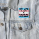 Knappen är ett politiskt påstående! Med så mycket anti-trans-lagstiftning i USA får man höra att det finns en "radikal agenda" - när i själva verket bara människor försöker leva ett säkert liv. Anpassadet, eller bara behålla det så det är.
