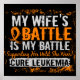Leukemi Tee-Shirts, Apparel, Gifts och Merchandise När din fru bekämpar leukemi blir hennes strid din. Stödja denna modiga leukemi-krigare med My Battle too t-shirts, kläder, hooker, knappar, sweatshirts, klistermärken, presenter och varor som har grym text och ett plågat leukemiband för orange på en svart graffiti-stil-bakgrund.