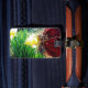 Mjölk med röd vingar och lila-klänning melling i gulten Daffodils Flowers Fairy and Photo by Artist Sandy Closs Fairy, älvors, pixie, pixies, fantasi, blommor, fjäril, fjärilar, rött, gult, lila, vår, saga, farbar och vind