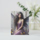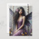 En älv i en lila klänning står i en vacker fågelskog i träd