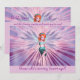 En magisk modern dagstidning med lila vinge, ett alisband i hennes röda hår och ett ben lyfte medan hon flög genom en pastellpräglad färgad starster av pinkar och lila i rymden.