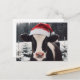 En vacker svart och vit ko bär på en jultomteatkonst.