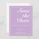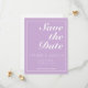 Söt, modernt, minimalistiskt och trendig bröllop spara datum har en mjuk bakgrund för lila av pastellprodukter med vita textblock av anpassade i modernt typsnitt. Lägg till den anpassade QR-koden för bröllop-webbplatsen på baksidan.