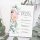 Ett vackert feminin inbjudningskort för möhippan med boho charm, denna elegant blommigt med vattenfärg har mjuk pastellrosa och persikofärgad ro och poppies med fin eucalyptus grey längs den lämnat gräns. Personlig textmallen med dina uppgifter. Den här inbjudan är tillgänglig som utskriven och papperslös digital nedladdning.