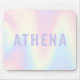 Trendig, personlig musknapp med mjuk bakgrund för regnbåge i mönster och ditt namn vid lätt lila.