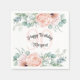 En vackert feminin papper napkin som firar en 90:e födelsedag har en gräns av vattenfärgspopier, ro, eukalyptus och fjällande grej i pastellbeige, rosa, grönt och blå grönt. Anpassa textmallen med hedersgästen namn och ålder. Dessa blöjor finns i tre storlekar: visas här på cocktail-storleka, de finns också tillgängliga på luncheon eller middag storlekt med antingen vanligt eller inkornigt kant.