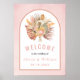 Tropiskt torkat handflatan-löv, pampasgräs och proteablommor, botaniskt välkomstposter av mjuk rosa bröllop. Den här fina bröllop-designen har ett ram på nedfläckad för rosa. I ram finns er text, en bukett av torkade löv från handflatan, proteablommor och pampasgräs.