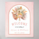 Tropiskt torkat handflatan-löv, pampasgräs och proteablommor rosa Arch botanical Welcome bröllop poster. Den här fina bröllop-designen har en ram på mjuk nedfläckad i rosa. I ram finns er text, en bukett av torkade löv från handflatan, proteablommor och pampasgräs.