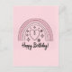 Mjuk rosa födelsedagskort med minimalistisk regnbågsdesign och en enkel linje konst hjärta form i mitten med orden 'Grattis på födelsedagen' skrivna under.