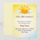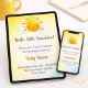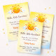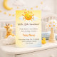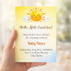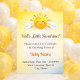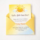 En mjuk akvarell solsken baby shower inbjudan med en varm leende sol, milda pastellfärgade himmelstoner och lätta luftiga moln. Den känsliga färgpaletten skapar en lugn och välkomnande atmosfär samtidigt som det glada solskenstemat står i centrum. Perfekt för vårens baby shower och solskensteman med en söt och elegant känsla.