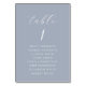 Hjälp dina gäster att hitta sina platser med lätthet och stil. Dessa mjuka støvblå bröllopsplatskartor med bordnummerkort har stora, läsliga nummer på mjuk støvblå färgbakgrund. Dubbelsidig tryckning säkerställer synlighet från andra sidan rummet, vilket gör att din mottagning flyter vackert. En del av "Delikat blå blomsterbröllopssamlingen".