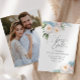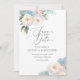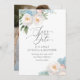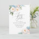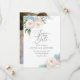 Elegant botaniskt bröllop spara datum med en bukett av mjukt elfenbensblått och rosa blommor och mjuk löv över klassisk vit bakgrund och namn och alla speciella uppgifter om bröllop som är skrivna i ett grått-typsnitt. Kortomvänt har plats för ditt bästa foto för lodrät Oavsett om du planerar en sommar-chic-firande eller en romantisk vår-affär, anger det här datumet perfektens tonläge för din speciella dag.