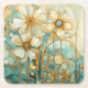 Blommor i persiko- och beige-nyanser. Ljust tealblå bakgrund med beige skuggor.