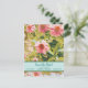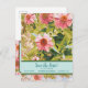 Spara datumet för din bröllopsdag med dessa vintage-utseende Spara datumet-vykort. Nyanser av rosa får dessa hattar att sticka ut bland bladen i olika gröna nyanser, färska från trädgården. En ljus turkos stapel kantad med djup teal ger ett område för din information om Spara datumet. Baksidan av kortet har ett större blått område omgivet av det blomsterrika mönstret. Anpassningsbara ord säger "Vi gifter oss och skulle älska att du är med. Ytterligare information och en inbjudan kommer att följa." Alla ord är helt anpassningsbara för att anpassa till ditt tillkännagivande. Denna design är originalkonst av Phyllis Dobbs och finns tillgänglig på flera koordinerade produkter. Helt anpassningsbar.