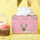 Desteis ursprungliga tecknad illustration av en söt, mjuk, jackat Wheaten Terrier-hund på rosa färg med mönster av hjärtformer.