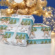 Desteis ursprungliga tecknad illustration av en söt, mjukt jackat hund av Wheaten Terrier-rasen. Hund placeras på en vinterscen med tre gröntar nära träd och fallande snö. Bakgrunden är en blå till vit övertoning som ge kallets vintag. Det finns ett anpassningsbara textområde som nu lyder: "God jul!" tillsammans med ett eget namn.