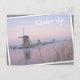 Ett vykort av ett sagolandskap med gamla vindkraftverk i det mjuka pastellljuset från en vintersoluppgång med is på floden och frost på raser en kall morgon i Kinderdyke, Nederländerna med texten "Kinderdijk". Kortet har en vit kant och är lite vridet för att skapa illusionen att lägga sig.