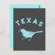 De här vykorten har en enkel illustration i stil av en myckingbird, den statliga fågeln i Texas, där Texas är skrivet ovan. Vattenblått illustration och text har en stil som är så illa att du kan titta tillbaka, vintage och som ställs in mot en grått-bakgrund med kol.