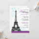 Elegant Mod Flourish Eiffel Torn Parisian Inbjudningskort för möhippan med en grått- Eiffel Torn atop a lila gräns längs grund med akvablåblommor i bakgrunden. Personlig det Paris-temade inbjudan med din möhippa och skicka dessa vackra inbjudningar eller nedladdningsbara digitala eviter till alla dina gäster.