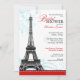 Elegant och modernt parisiskt Inbjudningskort för möhippa med ett grått- Eiffel Torn atop ett rött grund gräns med akvafblå blomning bakom sig.
