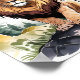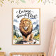 En akvarellillustration av ett lejon med en gyllene man. Lejonet sitter på en sten och har ögonen slutna. Det finns en fras skriven i kursiv ovanför lejonets huvud som säger "Mod genom Kristus". Bakgrunden är ett lugnt landskap med berg, träd och en himmel med moln.