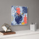 Indigo Blue Colorway. Skuggor av tvättat indigoblyer utgör bakgrunden till detta tryck med accenter av marinblått, denim blått, levande koral, krämer och kräm. Det är dags för sommaren.. hela året. Vår moderna tropiska abstrakt har monstera löv och andra organiska former. Den här återutskriften är underbar för tropisk dekoration, sovrum, tassar, strandhus med mera. Den här designen finns i flera färgrutor.