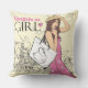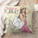 Snyggt dekorativt dekorativ kudde med en mode-flicka med väska i sketch stil på stadens bakgrund.