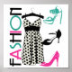 Utformning av en svart och vit polka med prickad klänning i mitten, högklackar i turkos, shock rosa och svart vid högerna och ord (mode) i samma färg vid lämnat
