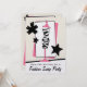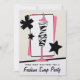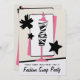 En inbjudan till mode klädutbytesfest med en illustration av en zebrarandig och rosa klädform omgiven av dekorativa svarta stjärnor och en rosa, svart och vit bakgrund. Anpassa texten på framsidan och baksidan.