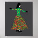 En vektorgrafik av en dam som modellerar en klänning med naturliga mönster.