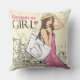 Stilfull dekorativ kastkudde med en modeflicka med väska i skissstil mot en stadsbakgrund.