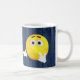 Moderiktig emojikaffemugg i en blåttträbakgrund. Design© av Nayda Liz Rivera