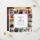 Ett mycket speciellt men modernt bröllop spara datum-kort som ska skickas till familj och vänner och som meddelar datumet för bröllop! På framsidan av designen finns 16 kvadratiska foton som du kan välja mellan med namn och datum för bröllop. På motsatt sida finns ett stort foto och ett överlägg med texten "Framtida herr och fru ADD NAMN och datum".
