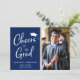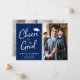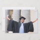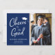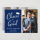 Modern 2-fotokort för studenten-meddelande. På framsidan står ditt student-foto bredvid "Cheers to the Grad" skrivet i ett modernt, vitt skript med en graderingshatt överst mot en marin blå bakgrund. Anpassa enkelt till student namn och skolan och lägg till ett foto på baksidan.