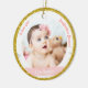 Trendig, elegant och söt personlig Första julen Flicka Ornament för en gudfader med ett vitt ram med snöflingor och stjärnor som har en rund öppning för ett anpassningsbar vågrät foto framtill och baktill, och ett böjt rosa på vardera sidan som visas namnens baby i ett typsnitt/typografi av eleganten, och på baksidan ett foto och anpassningsbarna "Första jul 20 2Y" (se till att du anpassar året!). På framsidan av ord står "I kärlek you, Godfather Jason!", som du kan anpassa eller ta bort. Med en (faux) guld glitter yttre ram.