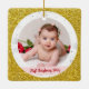 Trendig, elegant och söt personlig Första julen Flicka Ornament för en gudfader med ett vitt ram med snöflingor och stjärnor som har en rund öppning för ett anpassningsbar vågrät foto framtill och baktill, och ett böjt rosa på vardera sidan som visas namnens baby i ett typsnitt/typografi av eleganten, och på baksidan ett foto och anpassningsbarna "Första jul 20 2Y" (se till att du anpassar året!). På framsidan av ord står "I kärlek you, Godfather Jason!", som du kan anpassa eller ta bort. Med en (faux) guld glitter yttre ram.