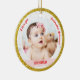 Trendig, elegant och söt personlig Första julen Flicka Ornament för en gudmor med ett vitt ram med snöflingor och stjärnor som har en rund öppning för ett anpassningsbar-vågrät på framsidan och baksidan, och ett böjt rosa på vardera sidan som visas namnens baby i ett typsnitt/typografi av eleganten, och på baksidan ett foto och anpassningsbarna "Första julen 20 2Y" (se till att du anpassar året!). På framsidan finns ord "I kärlek you, Godmor Johanna!", som du kan anpassa eller ta bort. Med en (faux) guld glitter yttre ram.