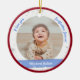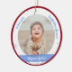 Trendig, elegant och söt personlig Första julen Pojke Ornament för en gudfader med ett vitt ram med snöflingor och stjärnor som har en rund öppning för ett anpassningsbar vågrät foto framifrån och bakåt, och ett böjt rosa på vardera sidan som visas namnens baby i ett typsnitt/typografi av eleganten, och på baksidan anpassningsbarna "Första jul 202X "(se till att du anpassar året!). På framsidan av ord står "I kärlek you, Godfather Jason!", som du kan anpassa eller ta bort. Med en yttre Julafton röd ram.