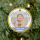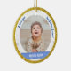 Trendig, elegant och söt personlig Första julen Pojke Ornament för en gudfader med ett vitt ram med snöflingor och stjärnor som har en rund öppning för ett anpassningsbar vågrät foto framifrån och bakåt, och ett böjt blått band på vardera sidan som visas namnens baby i ett typsnitt/typografi av eleganten och på baksidan ett foto och anpassningsbarna "Första jul 20 2Y" (se till att du anpassar året!). På framsidan av ord står "I kärlek you, Godfather Jason!", som du kan anpassa eller ta bort. Med en (faux) guld glitter yttre ram.