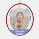 Trendig, elegant och söt personlig Första julen Pojke Ornament för en gudfader med ett vitt ram med snöflingor och stjärnor som har en rund öppning för ett anpassningsbar vågrät foto framifrån och bakåt, och ett böjt rosa på vardera sidan som visas namnens baby i ett typsnitt/typografi av eleganten, och på baksidan anpassningsbarna "Första jul 202X "(se till att du anpassar året!). På framsidan av ord står "I kärlek you, Godfather Jason!", som du kan anpassa eller ta bort. Med en yttre Julafton röd ram.