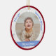 Trendig, elegant och söt personlig Första julen Pojke Ornament för en gudmor med ett vitt ram med snöflingor och stjärnor som har en rundöppning för ett anpassningsbar vågrät foto framtill och baktill, och ett böjt rosa på vardera sidan som visas namnen på babyen med ett typsnitt/typografi av eleganten, och på baksidan anpassningsbarna "Första jul 202X "(se till att du anpassar året!). På framsidan finns ord "I kärlek you, Godmor Johanna!", som du kan anpassa eller ta bort. Med en yttre Julafton röd ram.