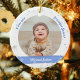 Trendig, elegant och söt personlig Första julen Pojke Ornament för morpa med ett vitt ram med snöflingor och stjärnor som har en rundöppning för ett anpassningsbar-vågrät-foto på framsidan och baksidan, och ett böjt rosa på vardera sidan som visas namnen på babyen med ett typsnitt/typografi av eleganten, och på baksidan anpassningsbarna "Första jul 202X" (se till att du anpassar året!) På framsidan av ord står "I kärlek you, Grandpa Jason!", som du kan anpassa eller ta bort.