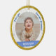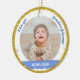 Trendig, elegant och söt personlig Första julen Pojke Ornament för mormor med ett vitt ram med snöflingor och stjärnor som har en rundöppning för ett anpassningsbar-vågrät-foto på framsidan och baksidan, och ett böjt blått band på vardera sidan som visas namnen på babyen med ett typsnitt/typografi av eleganten, och på baksidan ett foto och anpassningsbarna "Första jul 202 Y" (se till att du anpassar året!). På framsidan finns ord "I kärlek you, Grandma Johanna!", som du kan anpassa eller ta bort. Med en (faux) guld glitter yttre ram.