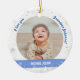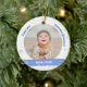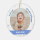 Trendig, elegant och söt personlig Första julen Pojke Ornament för mormor med ett vitt ram med snöflingor och stjärnor som har en rund öppning för ett anpassningsbar-vågrät-foto på framsidan och baksidan, och ett böjt blått band på vardera sidan som visas namnen på babyen med ett typsnitt/typografi av eleganten, och på baksidan anpassningsbarna "Första jul 202X" (första jul) (1) Se till att du anpassar året!) På framsidan finns ord "I kärlek you, Grandma Johanna!", som du kan anpassa eller ta bort.