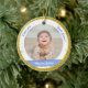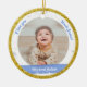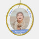 Trendig, elegant och söt personlig Första julen Pojke Ornament för en favoritmorbror med ett vitt ram med snöflingor och stjärnor som har en rundöppning för ett anpassningsbar-vågrät på framsidan och baksidan, och ett böjt blått band på vardera sidan som visas namnens baby i ett typsnitt/typografi av eleganten, och på baksidan ett foto och anpassningsbarna "Första jul 20 2Y" (se till att du anpassar året!). På framsidan av ord står "I kärlek du, farbror Jason!", som du kan anpassa eller ta bort. Med en (faux) guld glitter yttre ram.