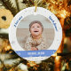 Trendig, elegant och söt personlig Första julen Pojke Ornament för en favoritmorbror med ett vitt ram med snöflingor och stjärnor som har en rundöppning för ett anpassningsbar-vågrät på framsidan och baksidan, och ett böjt blått band på vardera sidan som visas namnens baby i ett typsnitt/typografi av eleganten, och på baksidan anpassningsbarna "Första jul 202X" (se till att du anpassar året!) På framsidan av ord står "I kärlek du, farbror Jason!", som du kan anpassa eller ta bort.
