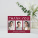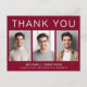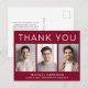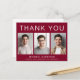 Modern burgunderröd examens tacksamhet vykort med 3 bilder av examen och "Tack", examenens namn, skola och årskurs i enkel vit typografi. Anpassa ditt tackmeddelande på baksidan och lägg till ditt namn i en signaturliknande stil.