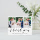 Skicka en anpassningsbar, ett modernt fotokollage-tack till din familj och dina vänner för att tacka dem för att de närvarade vid bröllop. Den här elegantens designmall innehåller tre av dina bröllop-foton som är inramade i vitt. Under det svarta kalligrafiskriptet står det "Tack" med ditt namn och datum som du kan anpassa. Kortets baksida har ett meddelande och namnteckning accentuerat av en vattenfärgad eukalyptus greenery. Det var en glädje att skapa för dig. Gratulerar på giftermål! Designad av konstnären ©Susan Coffey.