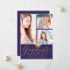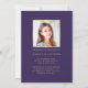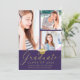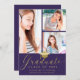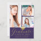 Det här moderna studenten-annonskortet med anpassningsbar 4-fotokollage kommer att vara perfektens val att skicka till din familj och dina vänner. På kortets framsida finns tre foton som du kan byta till din egen kant på lila. Under det moderna faux guld-skriptet står det "Student" med klassår, namn och skola för att anpassa sig. Kortets baksida har ett foto på 4:e plats med mer information om studenten och framtida anpassningsplaner. Gratulerar på studenten! Designad av Susan Coffey.